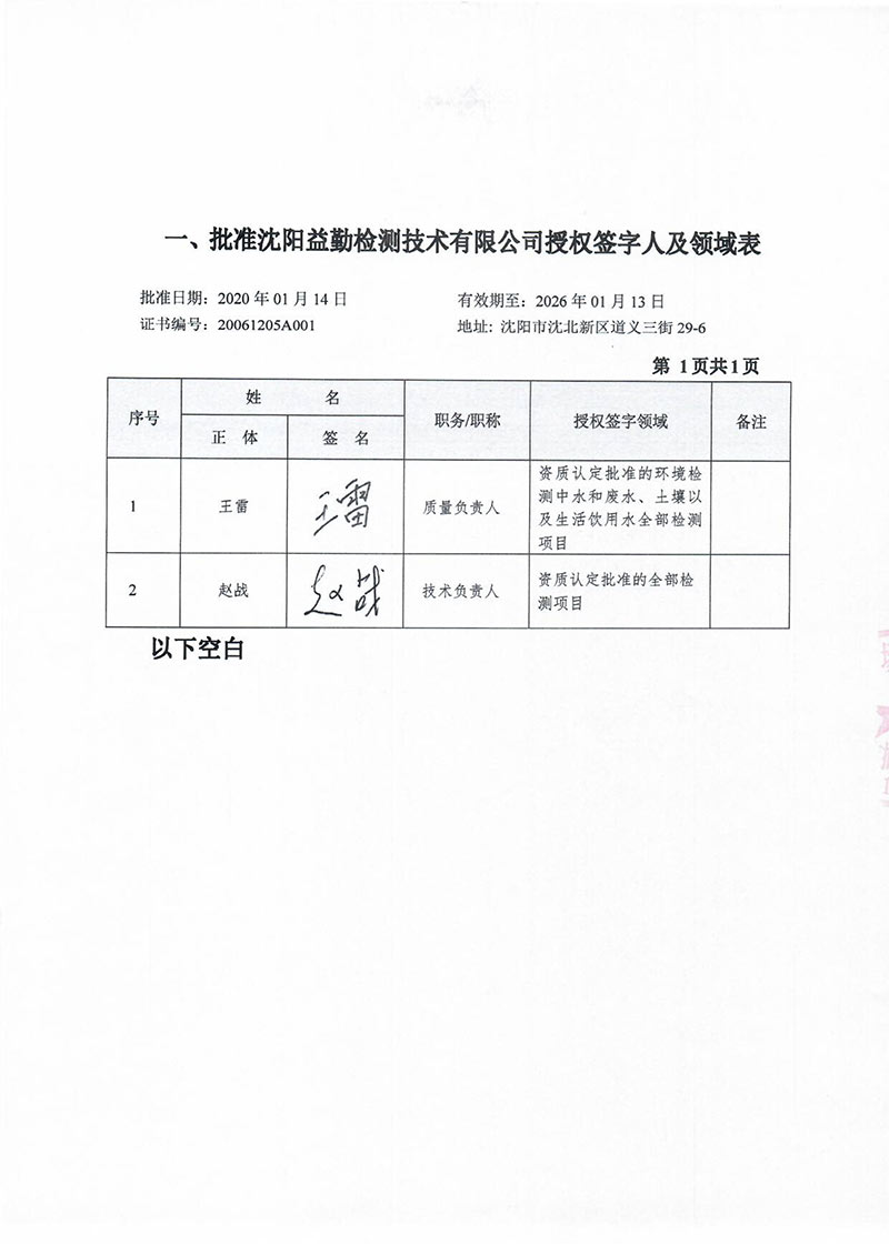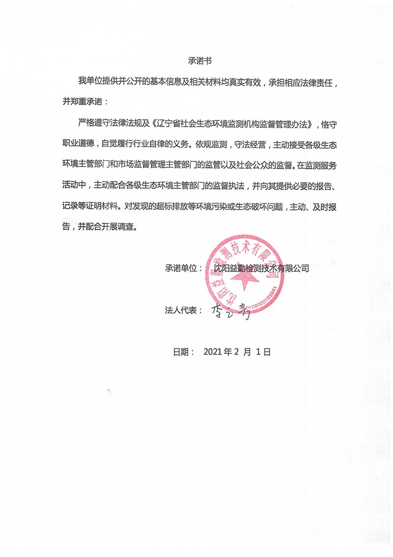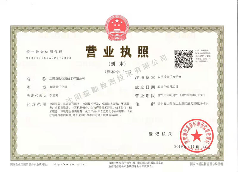 沈陽益勤檢測技術有限公司是具有獨立法人資格的第三方檢測服務機構,公司成立于2013年2月,注冊資金1000萬元,位于沈陽市沈北新區道義三街29-6.公司已獲得CMA認證,可提供地表水、地下水、生活污水、工業廢水、環境空氣、污染源廢氣、室內空氣、土壤質量、固體廢物、和噪聲等方面提供環境檢測服務,可滿足各單位在驗收比對、環境影響評價現狀檢測、管理體系審核檢測、污染源常規檢測、等多方面的環境檢測需求。 檢驗檢測機構資質認定證書 營業執照